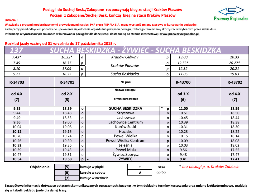 Wójt Gminy Radziechowy Wieprz informuje, że od dnia 2 października br. Spółka Przewozy Regionalne