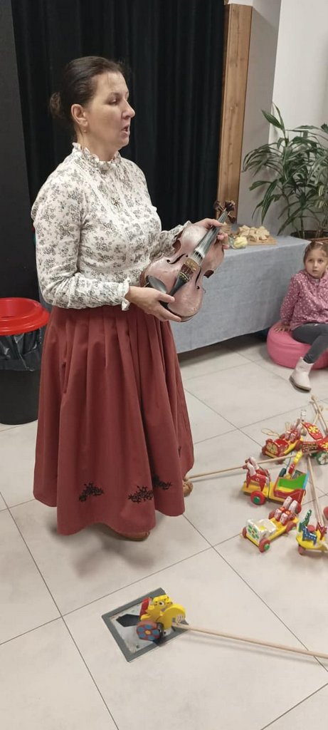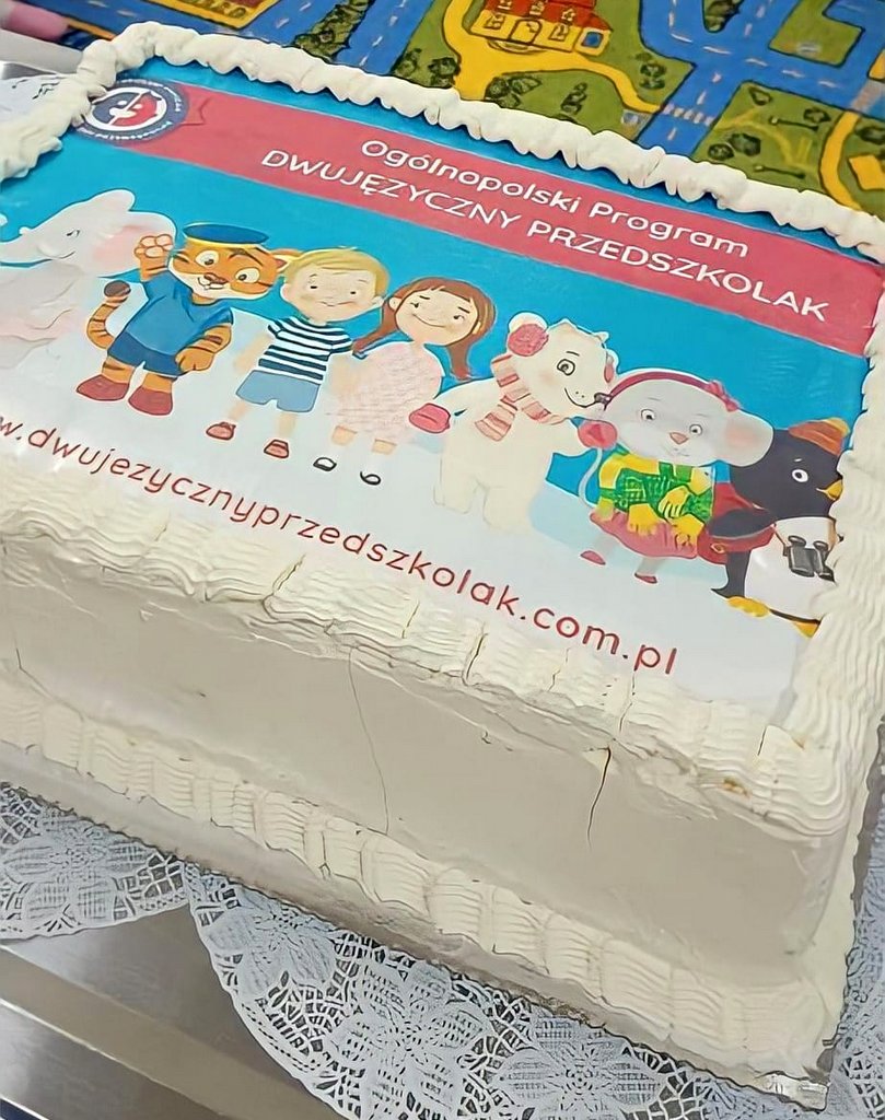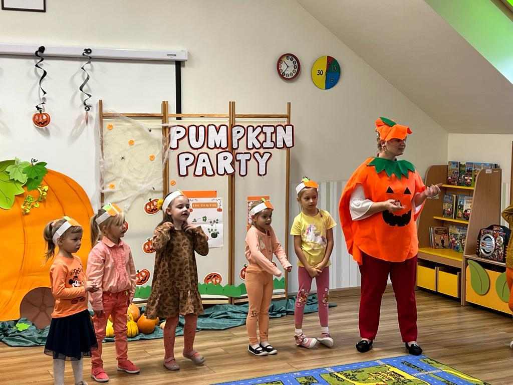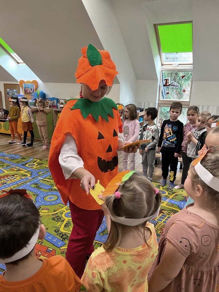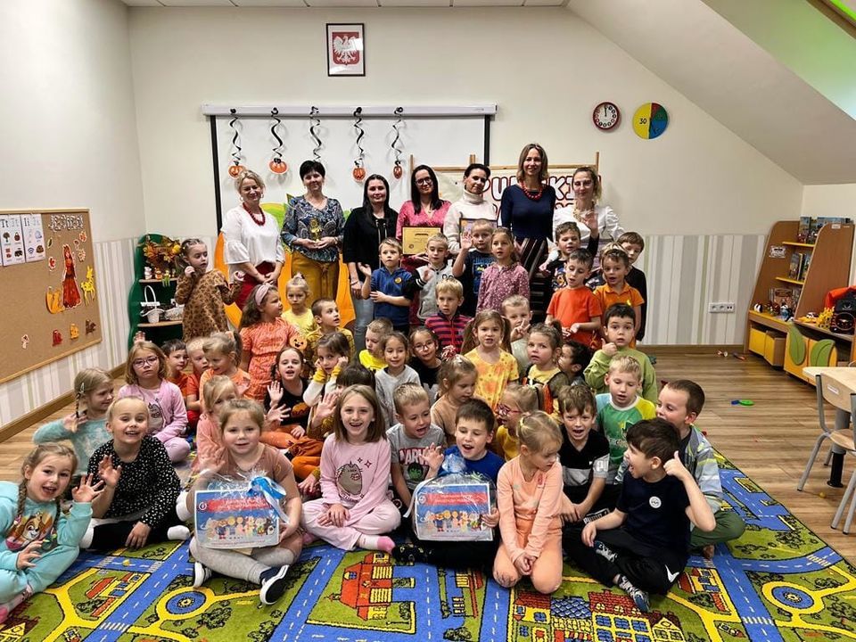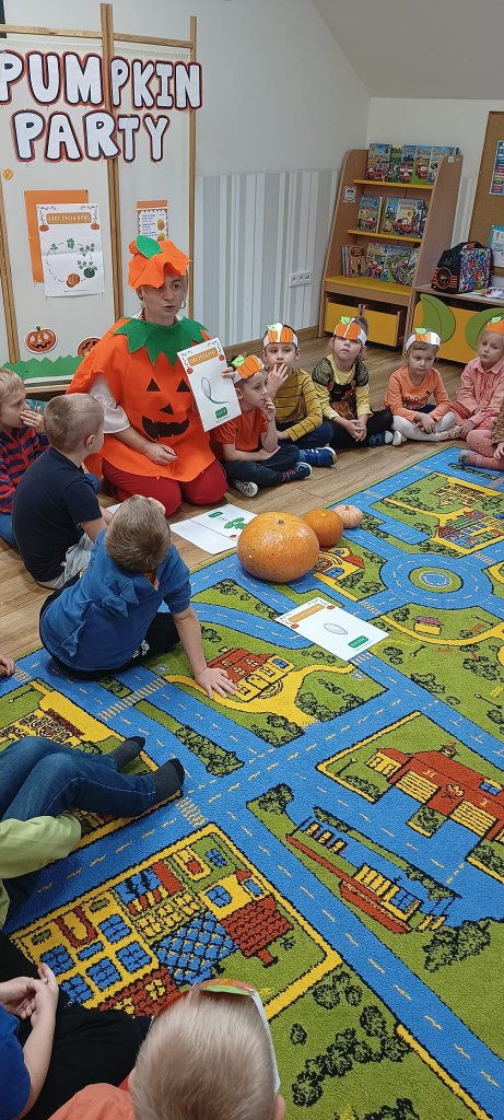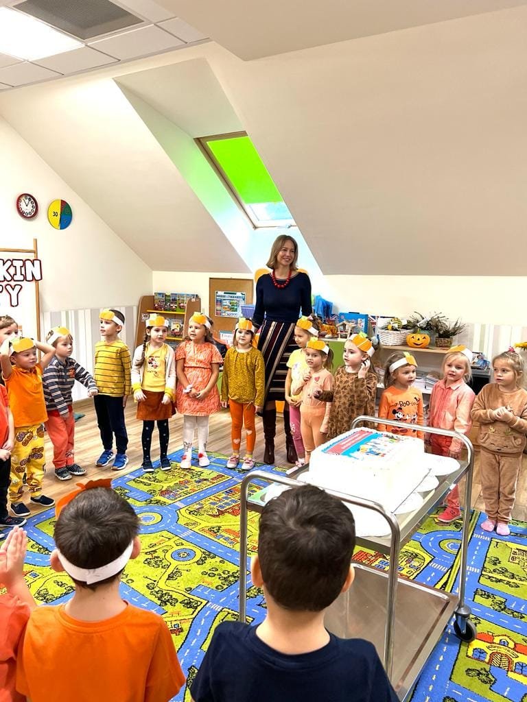 25.10.2023r. w naszym przedszkolu odbyły się integracyjne zajęcia z zakresu realizacji Ogólnopolskiego programu Dwujęzyczny Przedszkolak. Na zajęcia przyjechały do nas przedszkolaki z Zespołu Szkolno-Przedszkolnego nr 2 w Czechowicach Dziedzicach wraz ze swoimi wychowawczyniami i Panią Alicją Puzoń - dyrektorem tejże placówki. Swoją obecnością zaszczyciła nas również Pani Aneta Zwolińska – Prezes Fundacji Dwujęzyczny Przedszkolak. Wizyta naszych gości rozpoczęła się od warsztatów na temat naszej kultury Górali Żywieckich, które przeprowadziła Pani Brygida Murańska w sali Centrum Edukacji Ekologicznej. Podczas warsztatów dzieci miały możliwość zabawy drewnianymi zabawkami, grania na prostych ludowych instrumentach, a także mogły posmakować tradycyjnego chleba z masłem czosnkowym, popijając go herbatką z mięty. Następnie spacerkiem przedszkolaki udały się do naszej placówki, gdzie zostały przywitane w holu przedszkola przez dzieci z grupy Przyjaciele Planet. Zajęcia dydaktyczne z zakresu nauki języka angielskiego z wykorzystaniem platformy edukacyjnej Dwujęzycznego Przedszkolaka przy współpracy z Panią Moniką Więcek przygotowała i przeprowadziła Pani Izabela Dudek- anglista, nauczyciel wychowania przedszkolnego oraz metodyk Dwujęzycznego Przedszkolaka. W czasie zajęć dzieci utrwalały i doskonaliły swoje kompetencje językowe w zakresie posługiwania się językiem angielskim, uczestnicząc w zabawach słowno – muzycznych oraz ruchowych pod hasłem Pumpkin Party. Po zajęciach na naszych gości czekała niespodzianka w postaci ogromnego tortu ufundowanego przez Fundację Dwujęzyczny Przedszkolak.