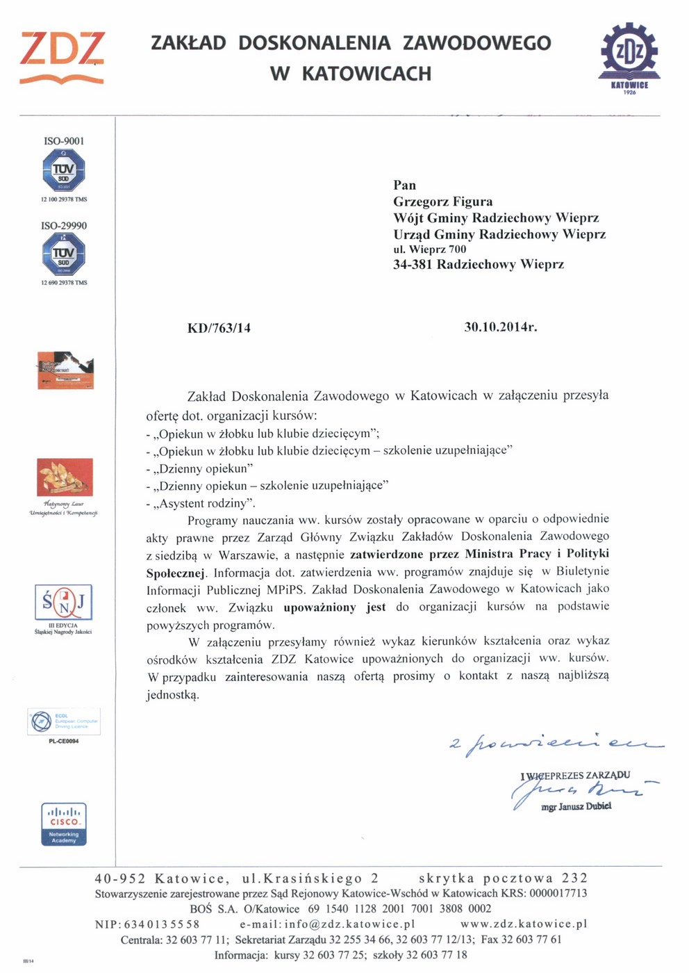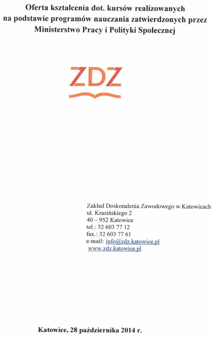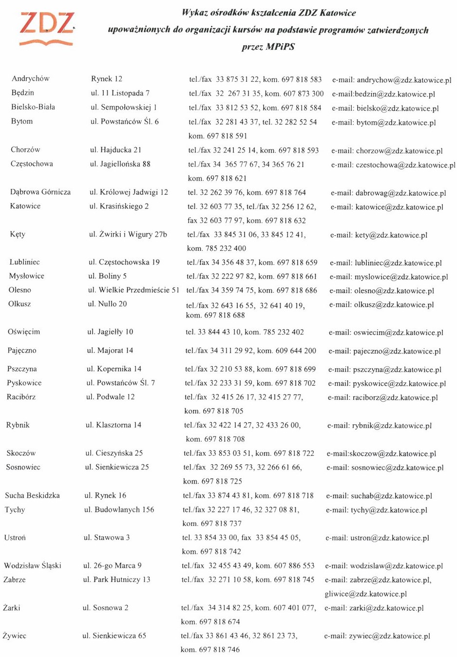 W załączeniu przesyłamy również wykaz kierunków kształcenia oraz wykaz ośrodków kształcenia ZDZ Katowice upoważnionych do organizacji ww. kursów. W przypadku zainteresowania naszą ofertą prosimy o kontakt z naszą najbliższą jednostką.