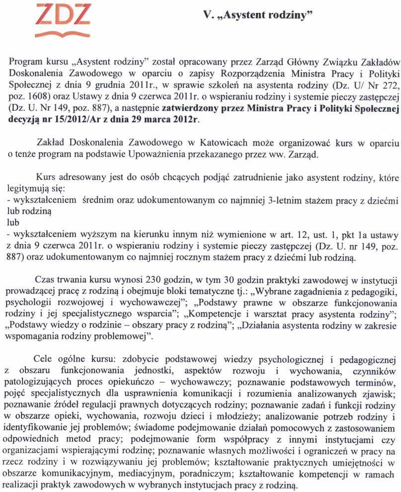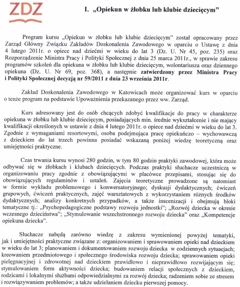 Programy nauczania ww. kursów zostały opracowane w oparciu o odpowiednie akty prawne przez Zarząd Główny Związku Zakładów Doskonalenia Zawodowego z siedzibą w Warszawie, a następnie zatwierdzone przez Ministra Pracy i Polityki Społecznej. Informacja dot. zatwierdzenia ww. programów znajduje się w Biuletynie Informacji Publicznej MPiPS. Zakład Doskonalenia Zawodowego w Katowicach jako członek ww. Związku upoważniony jest do organizacji kursów na podstawie powyższych programów.