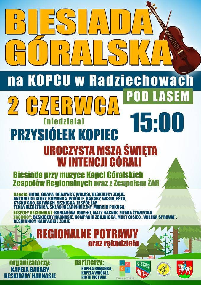 Przed nami kolejne GÓRALSKIE ŚWIĘTO - na KOPCU w Radziechowach. Już 2 czerwca o godz.: 15:00 odbędzie się uroczysta Msza Święta w intencji wszystkich GÓRALI. Po Mszy odbędzie się BIESIADA przy muzyce Zespołu ŻAR. Będzie to niezwykłe wydarzenie zrzeszające Kapele z naszego regionu. Serdecznie zapraszamy wszystkich na ten piękny wieczór przepełniony muzyką góralską i dobrą zabawą. Będzie można kupić pyszne regionalne potrawy przygotowane przez Koła Gospodyń Wiejskich oraz rękodzieło.