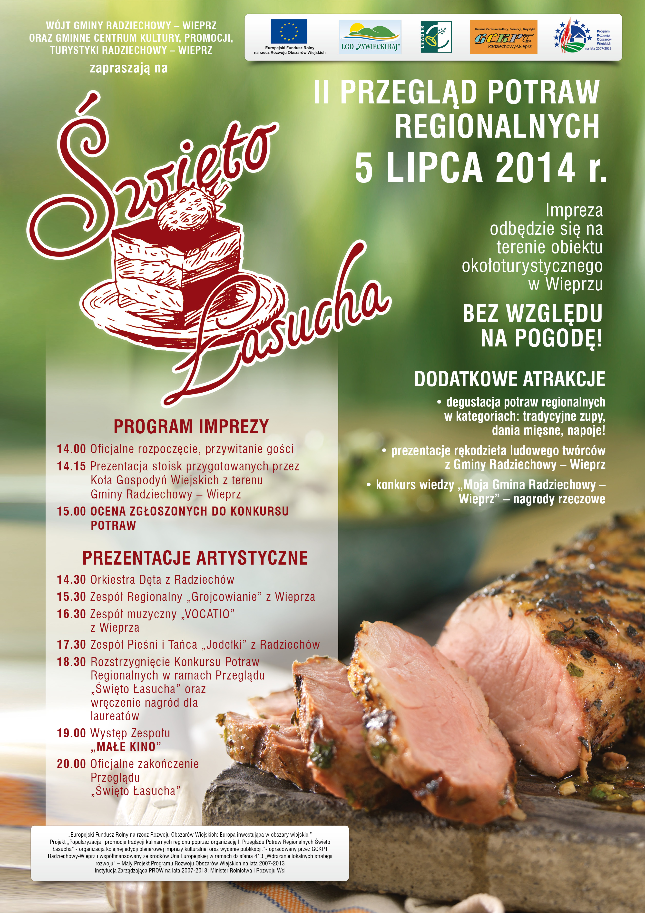 Projekt „Popularyzacja i promocja tradycji kulinarnych regionu poprzez organizację II Przeglądu Potraw Regionalnych Święto Łasucha” - organizacja kolejnej edycji plenerowej imprezy kulturalnej oraz wydanie publikacji.”- opracowany przez GCKPT Radziechowy-Wieprz i współfinansowany ze środków Unii Europejskiej w ramach działania 413 „Wdrażanie lokalnych strategii rozwoju” – Mały Projekt Programu Rozwoju Obszarów Wiejskich na lata 2007-2013