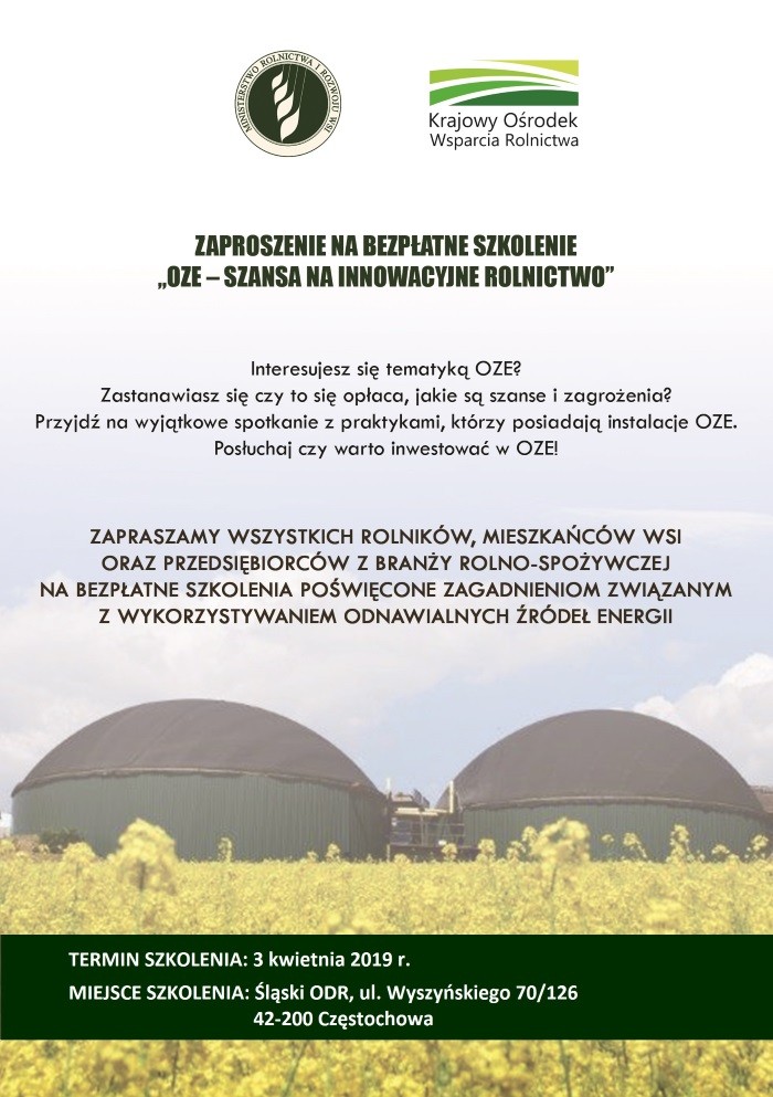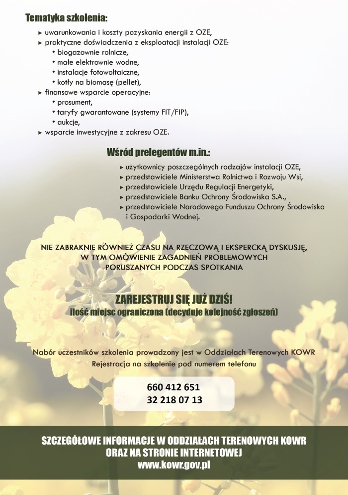 W miarę możliwości proszę o umieszczenie ulotki w widocznym miejscu bądź umieszczenie wiadomości na swojej stronie internetowej: http://www.kowr.gov.pl/odnawialne-zrodla-energii/szkolenia-oze