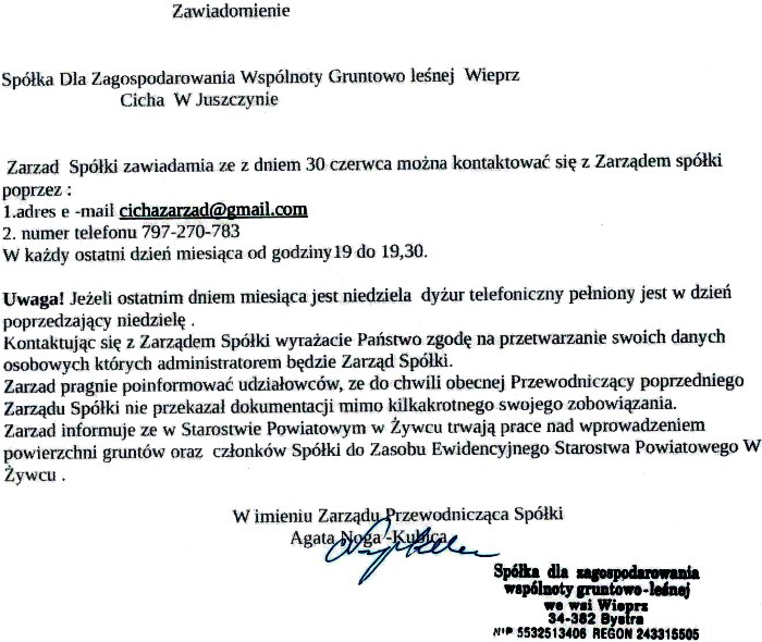 Zawiadomienie: Spółka Dla Zagospodarowania Wspólnoty Gruntowo Leśnej Wieprz Cicha w Juszczynie Dodano: 08.06.2020 r. Kategoria: Informacje ogólne