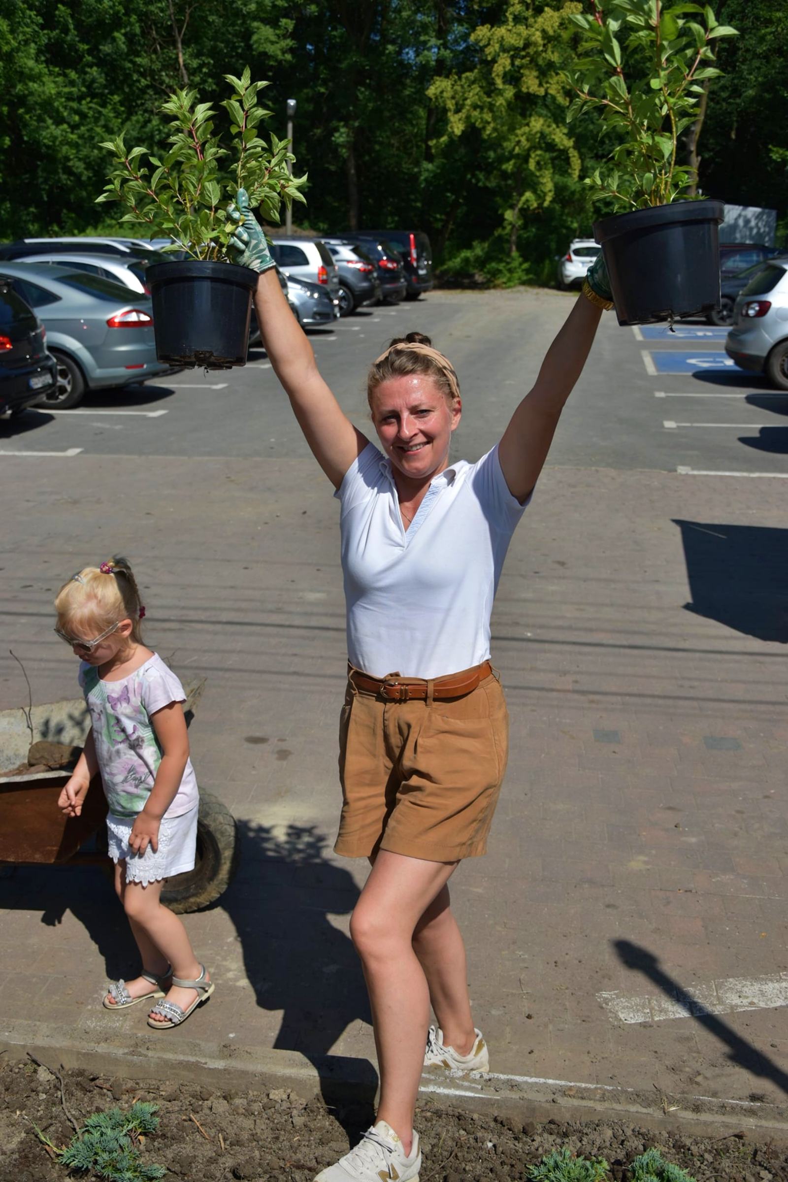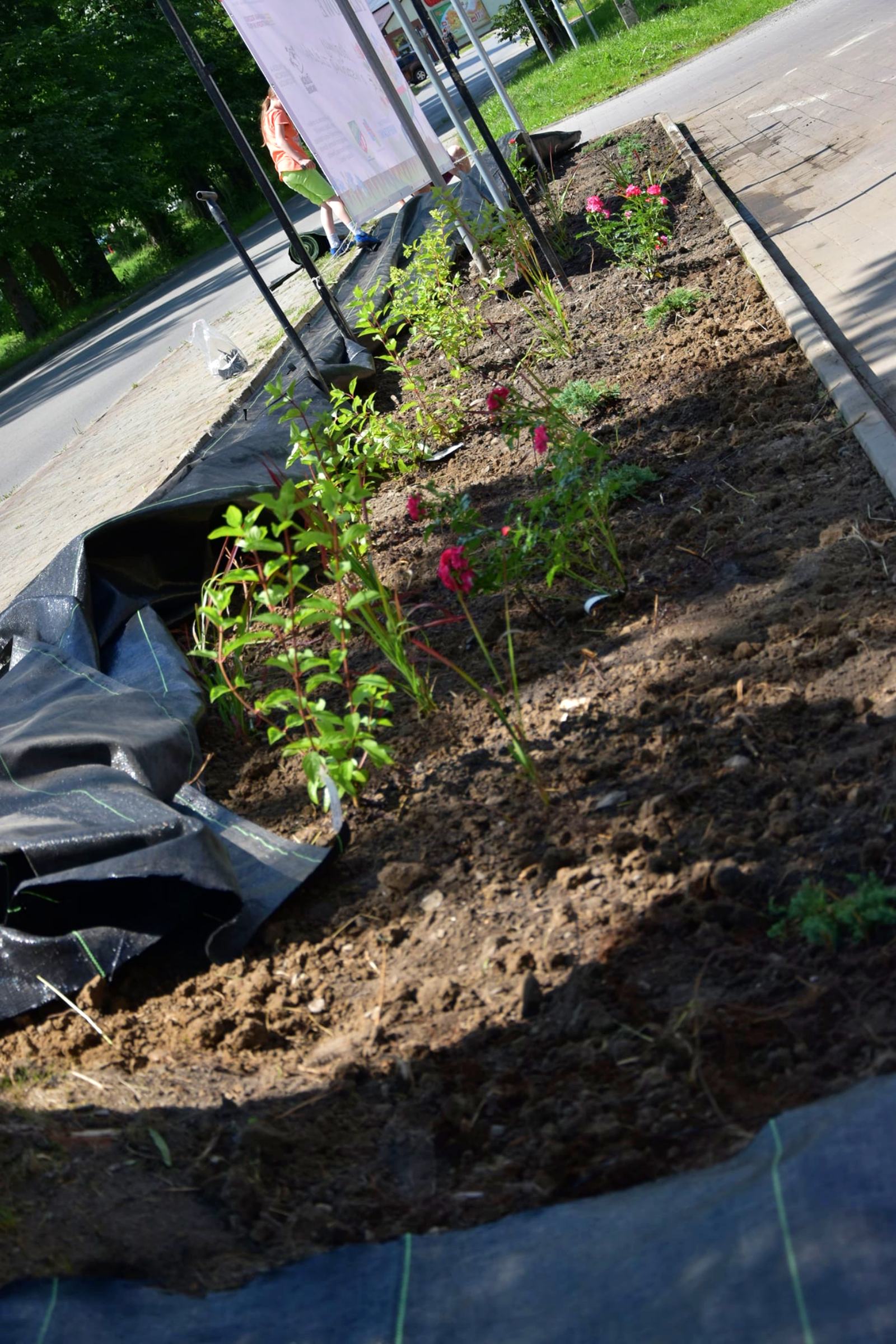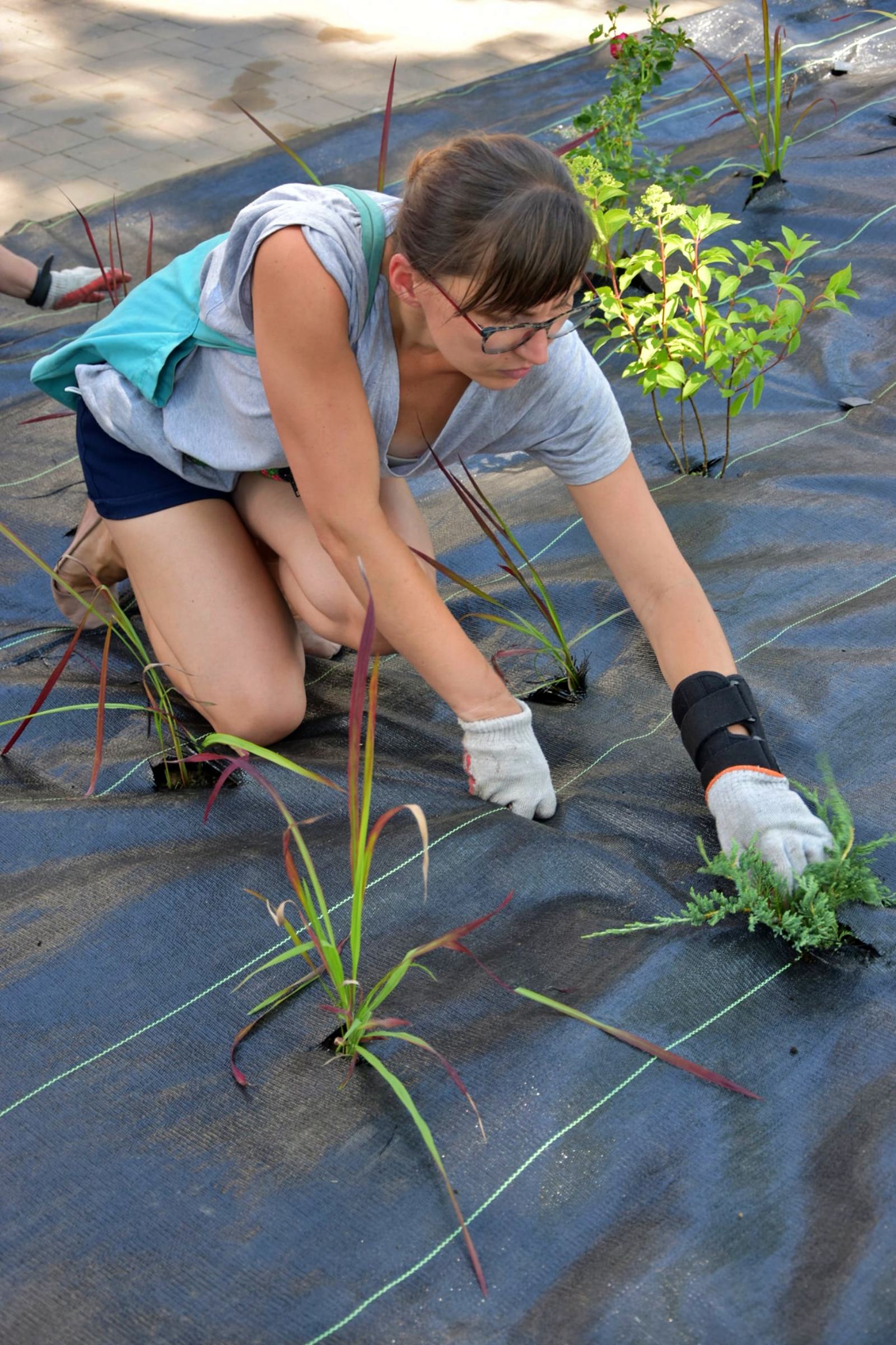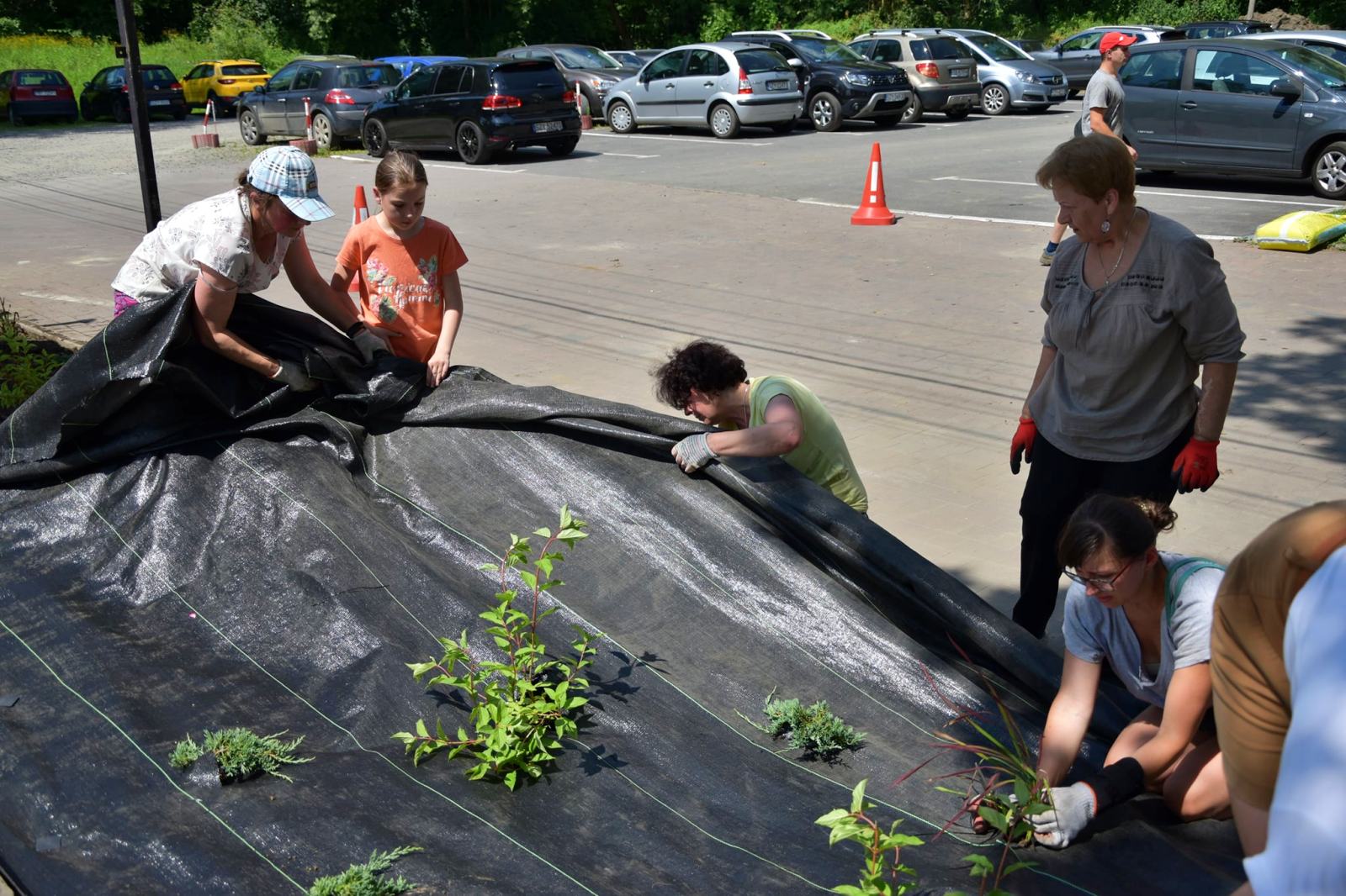 Co zrobiliśmy? W trakcie przygotowań do sadzenia została ściągnięta cała darń na wyznaczonym na działania warsztatowe terenie, została także nawieziona nowa warstwa ziemi, a także usunięto wiele kamieni i betonowych elementów, które uniemożliwiłyby sadzenie roślin. W ramach warsztatów posadzono blisko 300 roślin w tym 6 pięknych grabów. Rozpoczęto już także renowację trawnika, który nieco ucierpiał podczas przygotowań terenu. Rabaty zostały przykryte agrowłókniną oraz wykończone grysem.