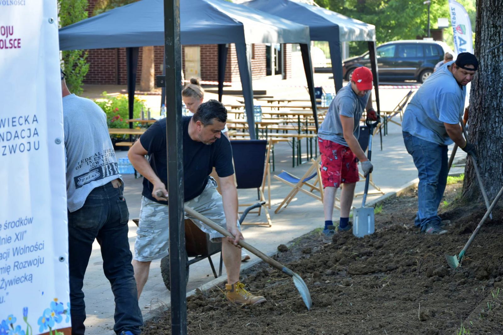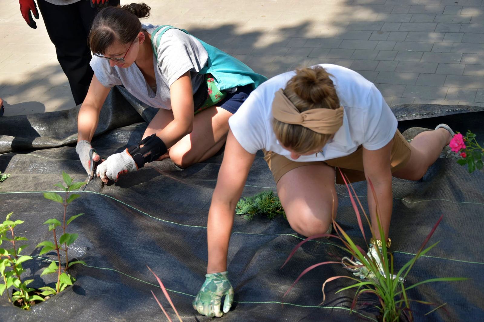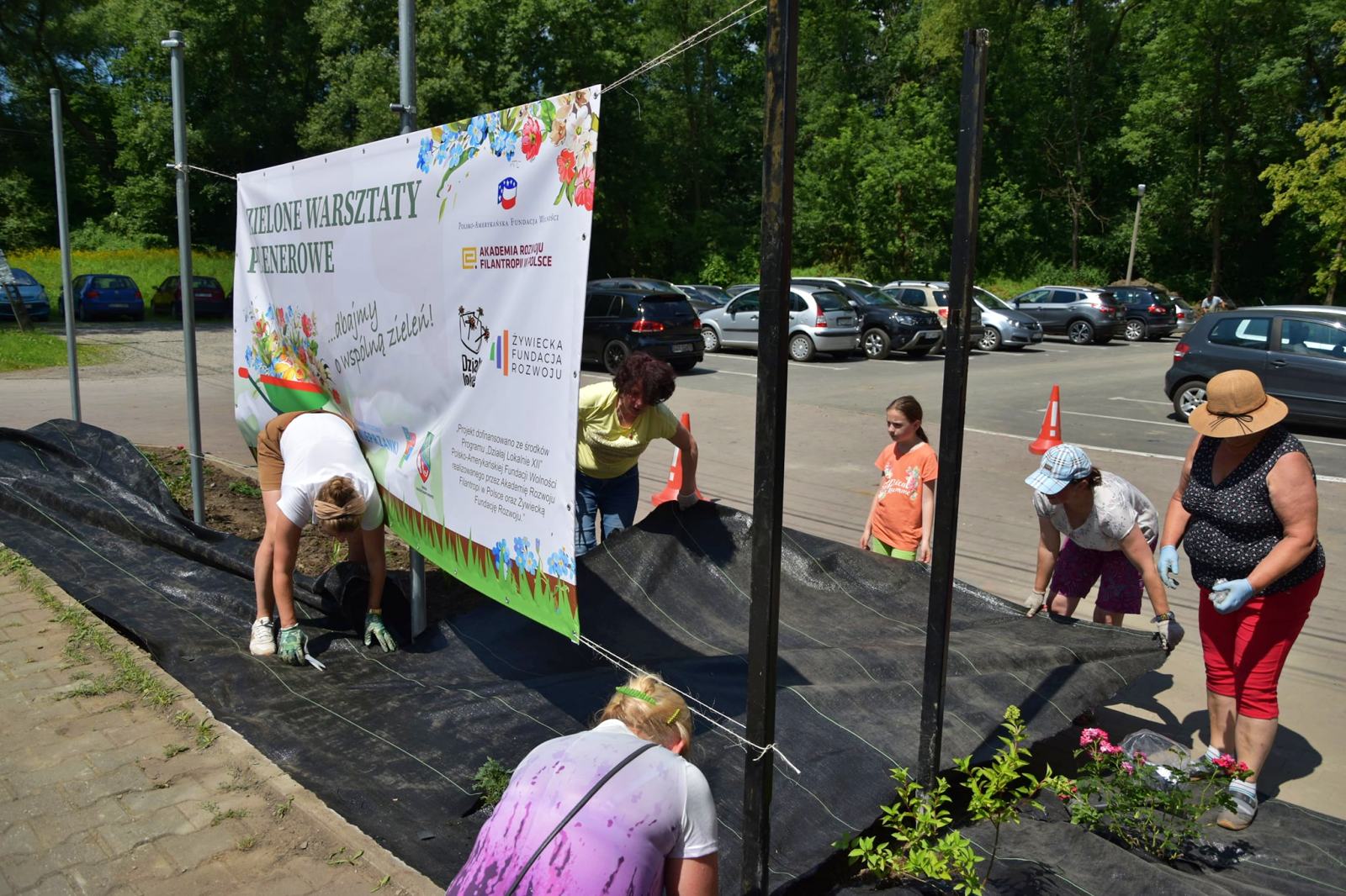 Co zrobiliśmy? W trakcie przygotowań do sadzenia została ściągnięta cała darń na wyznaczonym na działania warsztatowe terenie, została także nawieziona nowa warstwa ziemi, a także usunięto wiele kamieni i betonowych elementów, które uniemożliwiłyby sadzenie roślin. W ramach warsztatów posadzono blisko 300 roślin w tym 6 pięknych grabów. Rozpoczęto już także renowację trawnika, który nieco ucierpiał podczas przygotowań terenu. Rabaty zostały przykryte agrowłókniną oraz wykończone grysem.