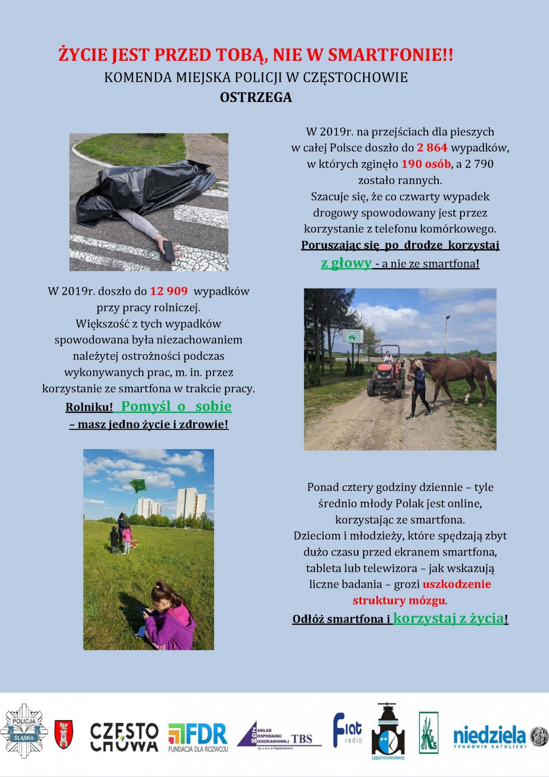 Od 16 czerwca ruszyła pełną parą kampania prewencyjna Komendy Miejskiej Policji w Częstochowie i Zakładu Gospodarki Mieszkaniowej TBS w Częstochowie pod nazwą "Życie jest przed Tobą, nie w smartfonie". Jednym z partnerów projektu jest Oddział Regionalny Kasy Rolniczego Ubezpieczenia Społecznego w Częstochowie. Akcja ma charakter profilaktyczno-edukacyjny a o jej przesłaniu możemy dowiedzieć się z przygotowanych w ramach kampanii spotów radiowych czy filmowych.