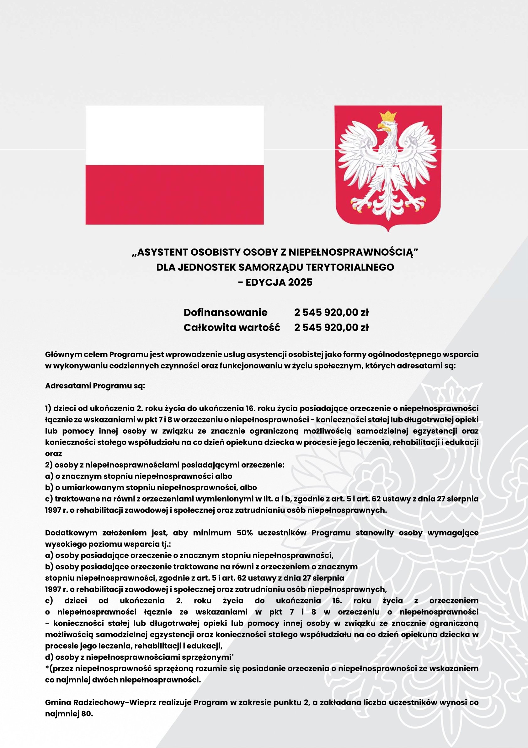 Asystent Osobisty Osoby z Niepełnosprawnością - edycja 2025 Gminny Ośrodek Pomocy Społecznej Radziechowy-Wieprz → Programy finansowane z Funduszu Solidarnościowego Przystąpienie do realizacji programu: "Asystent Osobisty Osoby z Niepełnosprawnością" - edycja 2025