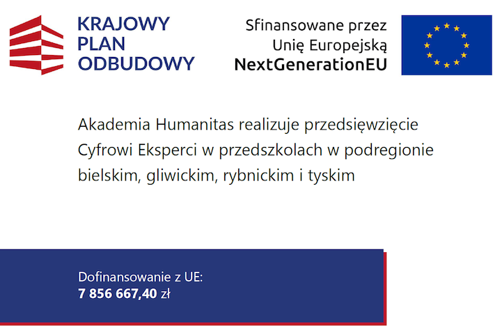 Akademia Humanitas wraz z Fundacją Silesia Nobiluim w okresie 1 września 2024 r. do 30 maja 2025 r. realizuje projekt „Cyfrowi Eksperci w przedszkolach w podregionie bielskim, gliwickim, rybnickim i tyskim” nr KPOD.05.08-IW.06-0037/24 dofinansowany przez Unię Europejską w ramach Krajowy Plan Odbudowy i Zwiększenia Odporności (KPO) - Szkolenia dla nauczycieli wychowania przedszkolnego.
