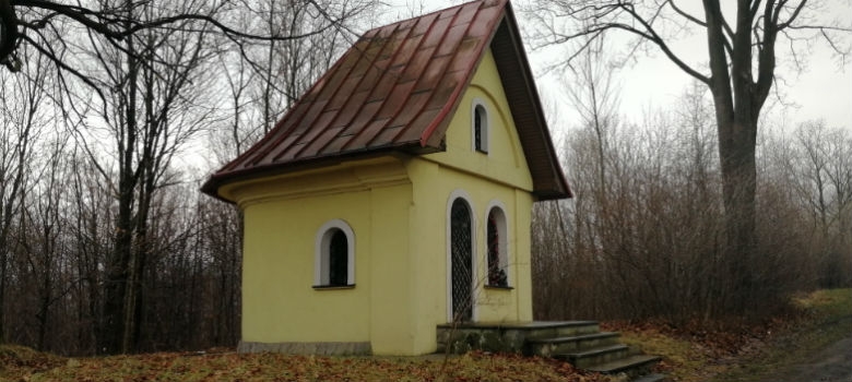 Pierwotnie znajdowała się tutaj figura Chrystusa upadającego, z datą fundacji 1829. Po blisko 40 latach w miejscu tym stanęła murowana kaplica. Obiekt wymurowany jest na rzucie prostokąta z absydą z tyłu budowli, nakryty dachem siodłowym, obecnie blaszanym, a wcześniej gontowym. W bocznych ścianach oraz na prawo od drzwi wejściowych znajdują się okna łukowe, zabezpieczone ozdobnymi kratami. Na kamiennym progu przy drzwiach wejściowych wyryto datę fundacji – 1868. Jej fundatorem był Maciej Foksa, który ufundował też trzy lata później znajdujący się wewnątrz ołtarzyk. Wnętrze kaplicy wyróżniało się sklepieniem kolebkowym, zastąpionym później żelbetonowym. W absydzie umieszczono ołtarzyk z dwiema kolumienkami oraz postument z kamiennym posągiem Chrystusa Upadającego pod krzyżem.